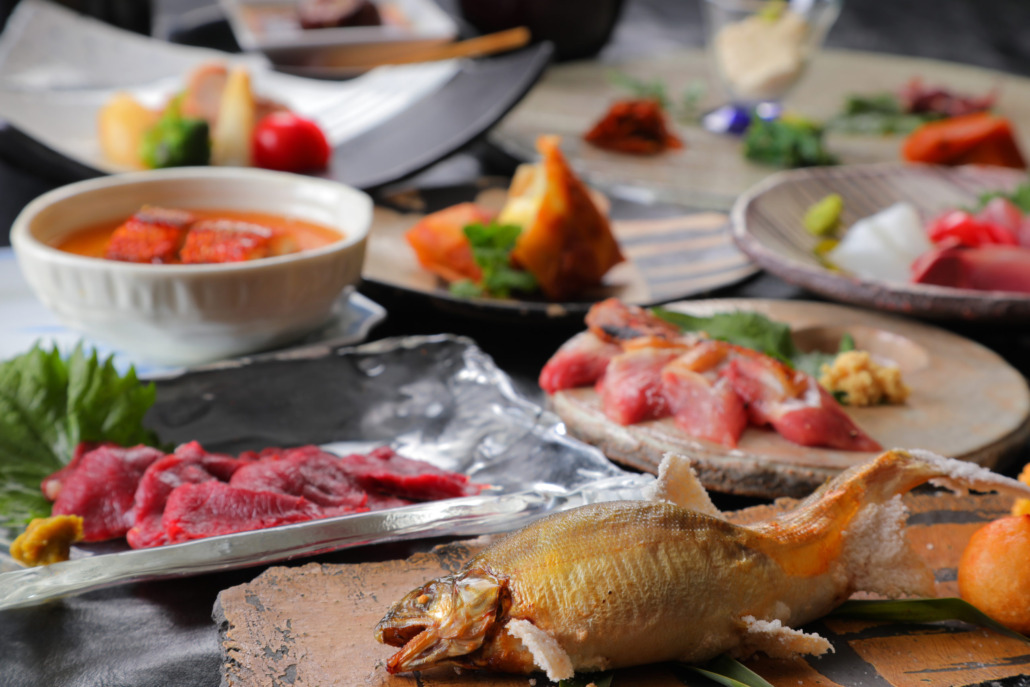 九州の宿で夕食部門第8位に選ばれた地産地消のこだわり料理をお腹いっぱい味わおう。