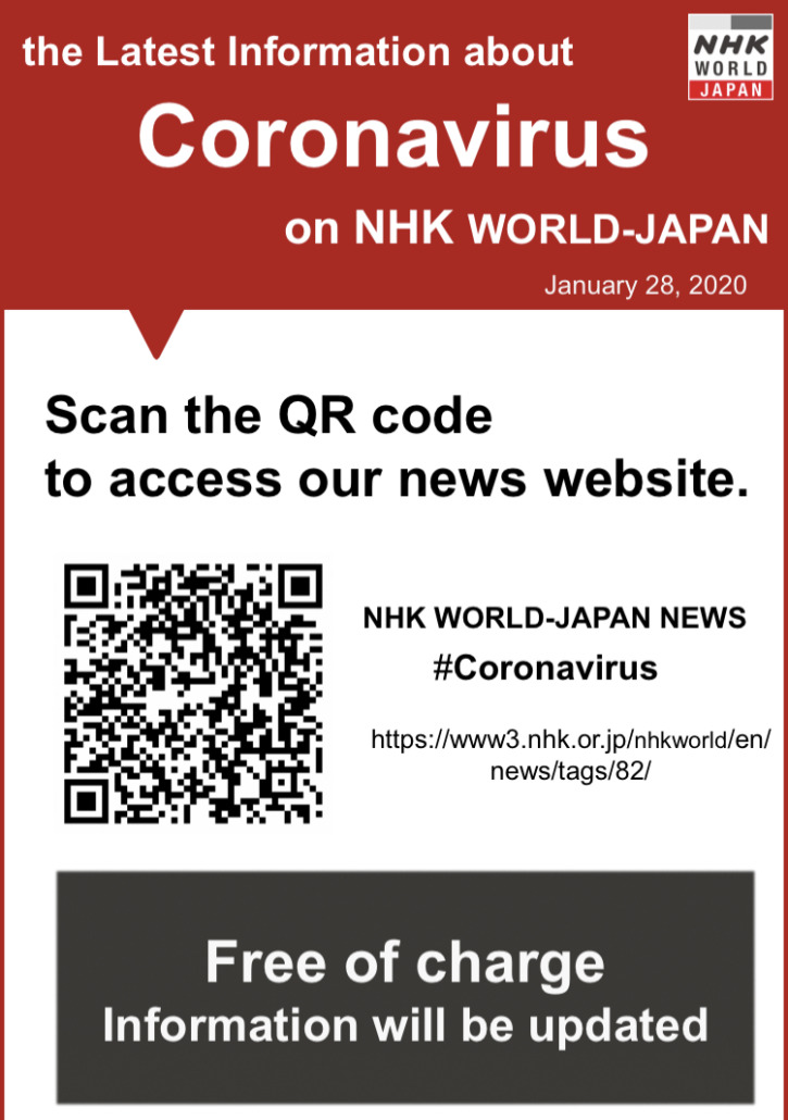 本日は、連日報道されている『新型コロナウィルス』について、NHKワールドJAPANから関連の情報提供がありましたので発信させていただきます。