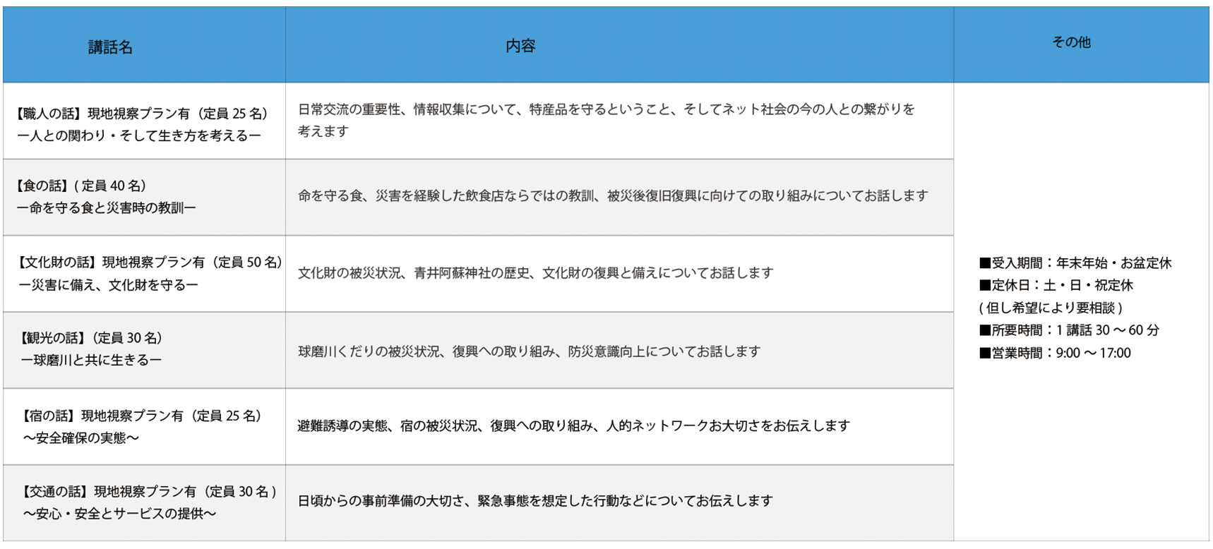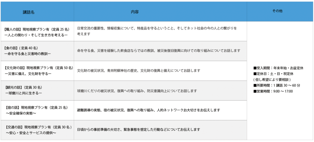 実際に被災を経験した地域事業者を講師とする、6つのプログラムをご用意しています。様々な業種のプロフェッショナルが「生の声」で災害の実情と備えをお伝えします。一部プログラムでは現地視察も可能です。