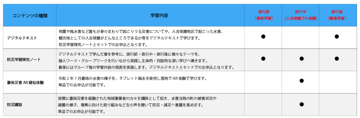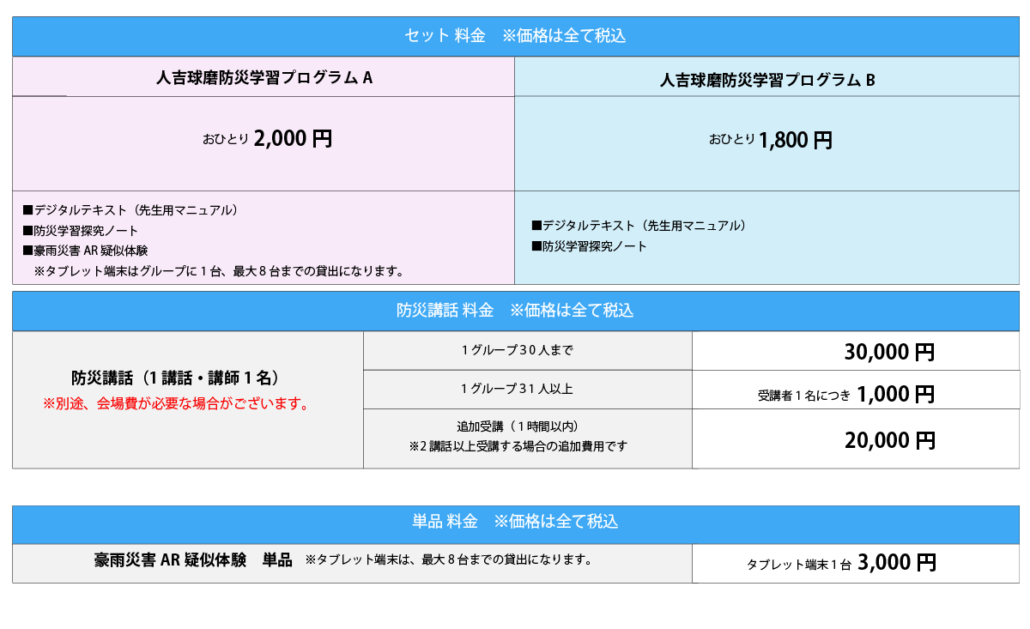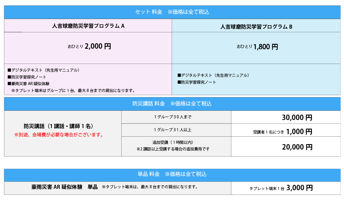 近年、私たちの身のまわりでは自然災害が数多く発生しており、次は自分が被災者になるかもしれないと感じることがあります。事前に自分の周囲の危険性を知ることや避難に対しての予備知識を持つことは「災害から生き抜く力」となります。人吉市は令和2年7月4日に発災した豪雨災害により甚大な被害を受けましたが、災害を経験して学んだことや教訓をもとに今回のプログラムを作成しました。このプログラムを体験し、活用することで「生きる知恵」を学び日々の生活につなげていただければ幸いです。