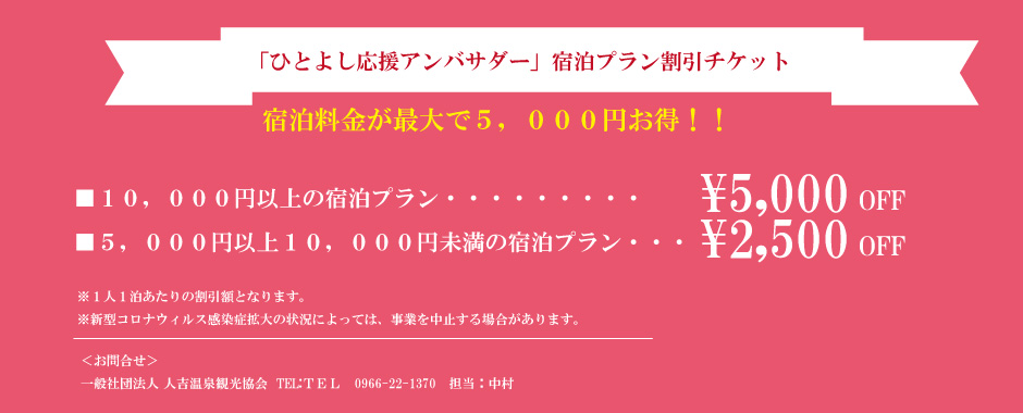 人吉市では新型コロナウィルス感染症の感染拡大防止の対策を講じつつ、地域経済の回復及び循環を図るため、令和2年6月初旬~7月31日(金)の間、熊本県民の皆様が、#ひとよし応援アンバサダー宿泊プランに参画している当市の宿泊施設に宿泊した場合、宿泊料金に対して割引(助成)を行います。特別宿泊プラン利用でお一人様最大5,000円もお得となります。
