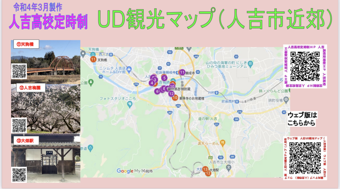 “UDマップ”とはユニバーサルデザインマップのことで、年齢や障害の有無、体格、性別など関係なく、できるだけ多くの方に分かりやすく利用いただくことを目的とされたマップのことを指しています。人吉高校定時制では、探究活動として令和2年7月豪雨で被災した人吉・球磨の復旧・復興をテーマに、写真や動画で人吉市内の観光名所とUD(ユニバーサルデザイン)の整備状況を紹介する「UD観光マップ」作成に取り組みました。
