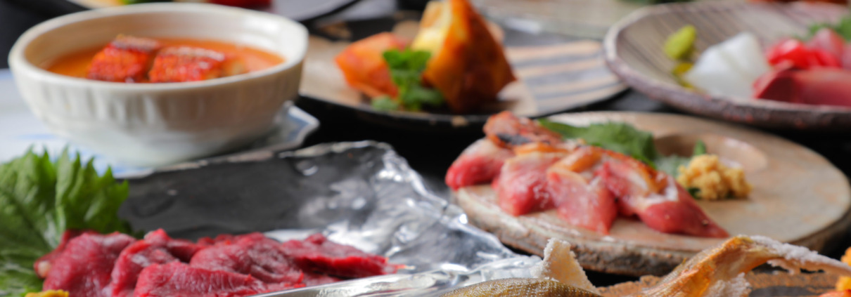 九州の宿で夕食部門第8位に選ばれた地産地消のこだわり料理をお腹いっぱい味わおう。